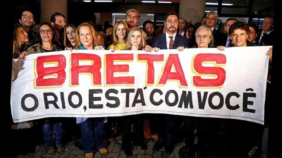 A mulher de Bretas, Simone Diniz, usa como foto principal de seu perfil uma imagem com diversos artistas – Caetano Veloso, Thiago Lacerda e Lucinha Lins e etc – segurando uma faixa com a frase: “Bretas, o Rio está com você”.