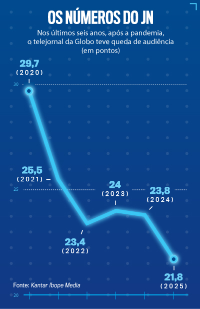 A dança das cadeiras é uma mudança de ares necessária não só para Bonner, mas também para o telejornal. Na noite do anúncio, o JN marcou 27,5 pontos de ibope, índice como há tempos a Globo não via, e turbinou sua programação no horário nobre. A façanha escancarou o maior desafio por trás da renovação do JN: a difícil tarefa de ampliar de forma consistente a audiência de uma atração que vem perdendo espectadores. De acordo com dados da Kantar Ibope Media, o telejornal atualmente tem uma média de 21,8 pontos na Grande São Paulo, principal mercado publicitário do país — cinco anos atrás, o índice chegava a 29,7 (veja o gráfico).