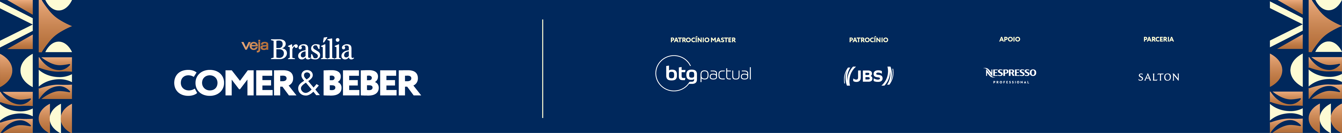 COMER & BEBER BRASÍLIA 2025/2026 é uma realização de VEJA com patrocínio master de BTG Pactual, patrocínio de JBS, apoio de Nespresso Professional e parceria de Salton.