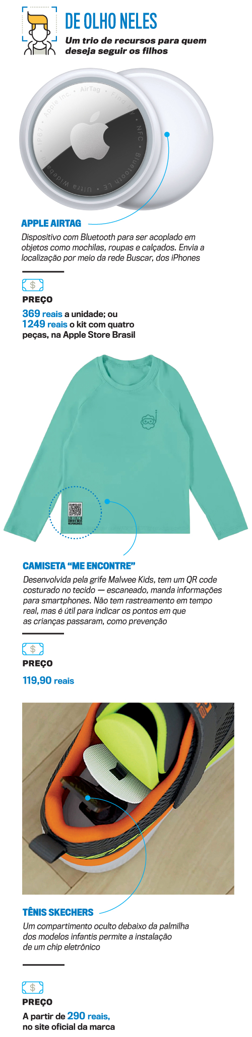 O rastreamento é, enfim, reflexo natural de quem já passou medo. O empresário e criador de conteúdo digital Thiago Dunker, ex-participante do reality show Ilhados com a Sogra, tomou um susto de acelerar o coração. Em viagem à Flórida com a família, perdeu de vista a filha, de 10 anos, em um outlet lotado, depois de a menina discutir com a irmã de 7 anos. “Foram só dois minutos, mas pareceram uma eternidade”, lembra Dunker. Quando foi encontrada, a menina estava trancada num provador. Naquele momento, ele logo pensou em algo que tivesse evitado o estresse, e esse algo estava à disposição nas lojas. Hoje, as meninas usam AirTags, pequenas etiquetas de acesso Bluetooth conectadas à rede de iPhones, da Apple. Os localizadores ficam presos por uma fitinha no pulso das crianças. De longe, são discretos. De perto, parecem relógios divertidos. “Não é algo do dia a dia, mas em viagens e lugares muito cheios dá uma tranquilidade enorme”, diz o pai. “O objetivo é dar liberdade para elas e segurança para nós, adultos.”