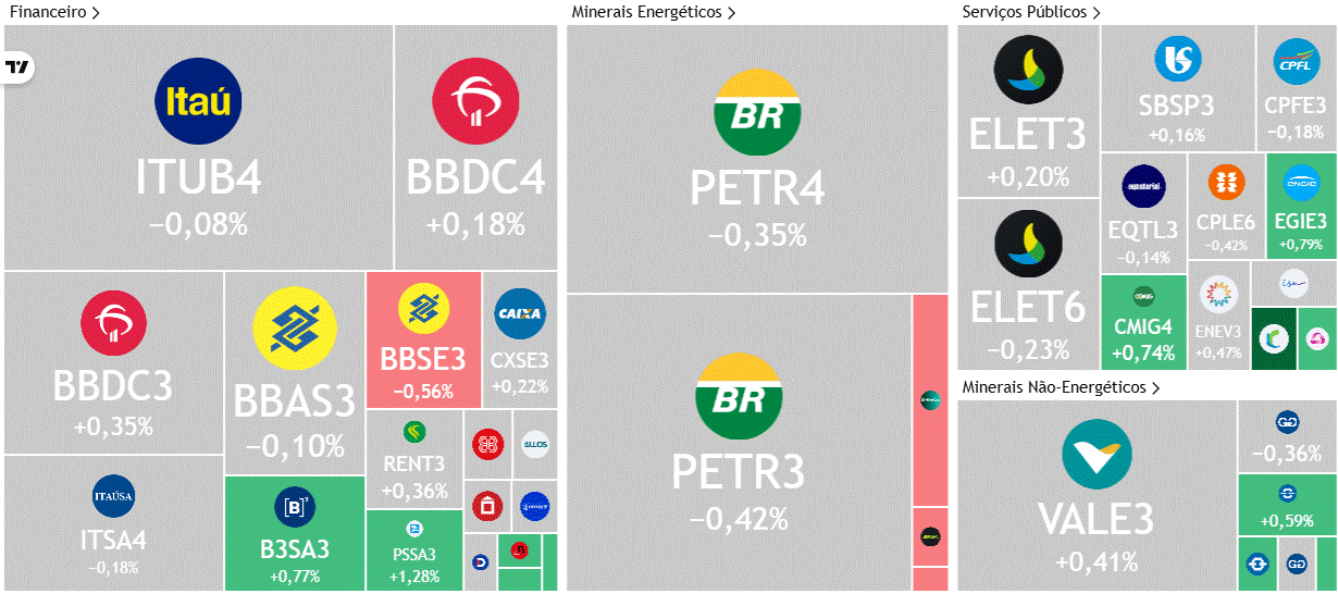 Confira abaixo o desempenho das principais ações do índice conforme o mapa de calor disponível no site da B3.