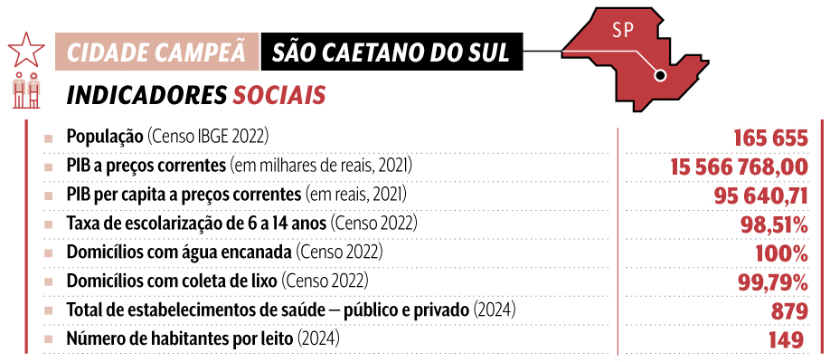 A saúde é outro motivo de orgulho para a gestão pública. “Acompanhamos os cidadãos desde a gestação até o envelhecimento”, afirma o secretário de Governo, Caio Lessio Previato. Os indicadores ajudam a explicar essa percepção: São Caetano registra uma das menores taxas de mortalidade infantil do país — 4,46 a cada 1 000 nascidos vivos — e uma expectativa de vida acima da média nacional, 78 anos, ante 74. A rede municipal oferece programas de atendimento para todas as faixas etárias. “Aqui todo mundo elogia a saúde pública, principalmente os idosos. Há postos dedicados a esse público em praticamente todos os bairros”, diz o corretor de seguros Elisio Peixoto, presidente da Associação Amigos de São Caetano do Sul.