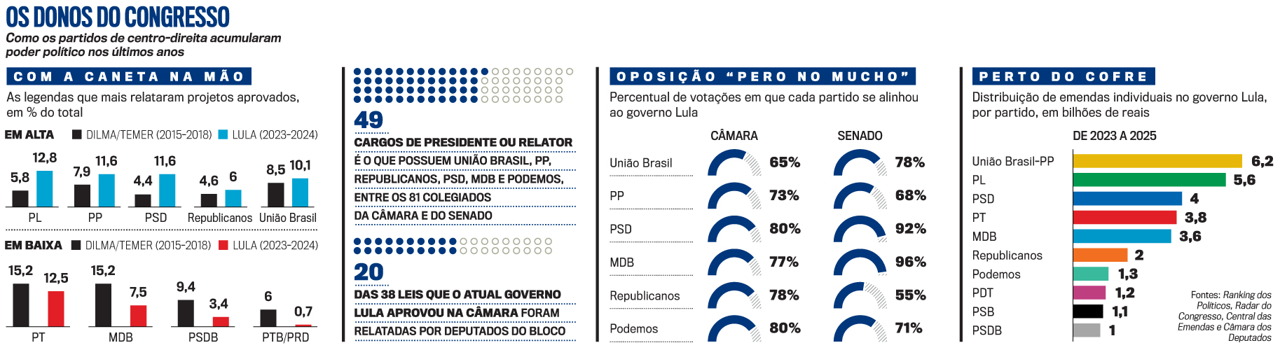 A força do Centrão serve de alerta a Lula. Além do peso do grupo nas eleições de 2026, o bloco exerce amplo domínio sobre a agenda legislativa e é vital para projetos do governo. Um exemplo é a proposta que amplia a isenção do imposto de renda para quem ganha até 5 000 reais por mês, cujo relatório está nas mãos de Arthur Lira (PP-AL). Outro projeto prioritário, a PEC da Segurança tem Mendonça Filho (União Brasil-PE) como relator. “Podemos ter divergências nas visões de mundo, mas o tema está acima de interesses eleitorais e nós buscaremos sempre o consenso da maioria”, diz. O governo não tem como ficar confortável — dos 38 projetos que aprovou no atual mandato, vinte foram relatados por políticos do Centrão (veja o quadro). Desde o governo Dilma Rousseff, cresceu de forma considerável a parcela de projetos aprovados por relatores desse agrupamento em contraposição ao declínio de partidos outrora influentes no Congresso como MDB e PSDB, segundo estudo elaborado pelo Ranking dos Políticos. “As relatorias mostram a real influência do Centrão sobre políticas públicas e a dependência do governo dessas alianças. O eixo de poder mudou nos últimos anos: não basta eleger o presidente da República, é o domínio do Congresso que faz a diferença”, avalia Juan Carlos Arruda, diretor-geral do Ranking dos Políticos.