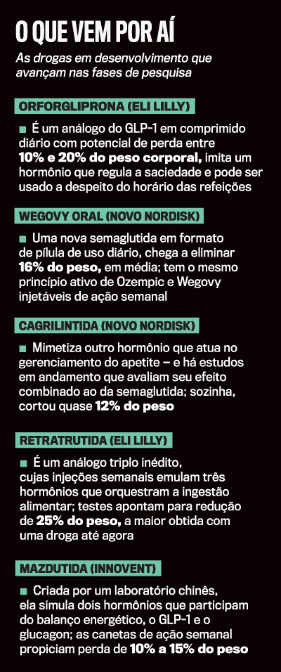 Apesar da aposta nas pílulas, a categoria das canetas ainda tem muito a oferecer. Inclusive em termos de novíssimas drogas. A Novo Nordisk investe em outro simulacro hormonal, a cargrilintida, que não é baseada no GLP-1. A Lilly, por sua vez, tem no portfólio o primeiro análogo triplo, que mimetiza três hormônios envolvidos no balanço energético e pode levar a perdas de peso similares às de uma cirurgia bariátrica. E outras empresas devem entrar na disputa. Da Ásia vem a mazdutida, o “Mounjaro chinês”, injeção que leva a reduções de 10% a 15% da massa corporal. Enquanto isso, com a queda das patentes, começam a chegar às drogarias nacionais as primeiras canetas de GLP-1 diárias 100% fabricadas no país pelas mãos da EMS. “Vivemos uma era muito frutífera e, na prática, teremos uma maior maleabilidade para indicar o que melhor se adapta às pessoas com diabetes e obesidade”, diz o endocrinologista Carlos Eduardo Barra Couri, da USP de Ribeirão Preto. No futuro, opções não vão faltar para o controle do peso. Ficará a gosto dos fregueses — o médico e o paciente.